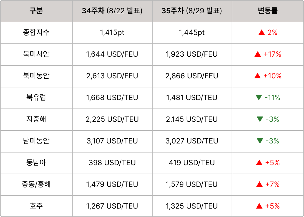 - SCFI 종합지수 1,445pt, 전주비 +2% 상승