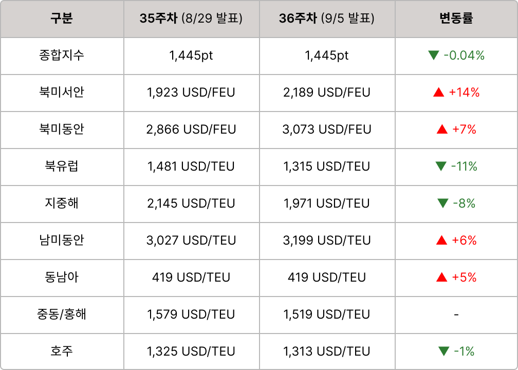 - SCFI 종합지수 1,444pt, 전주비 -0.04% 하락