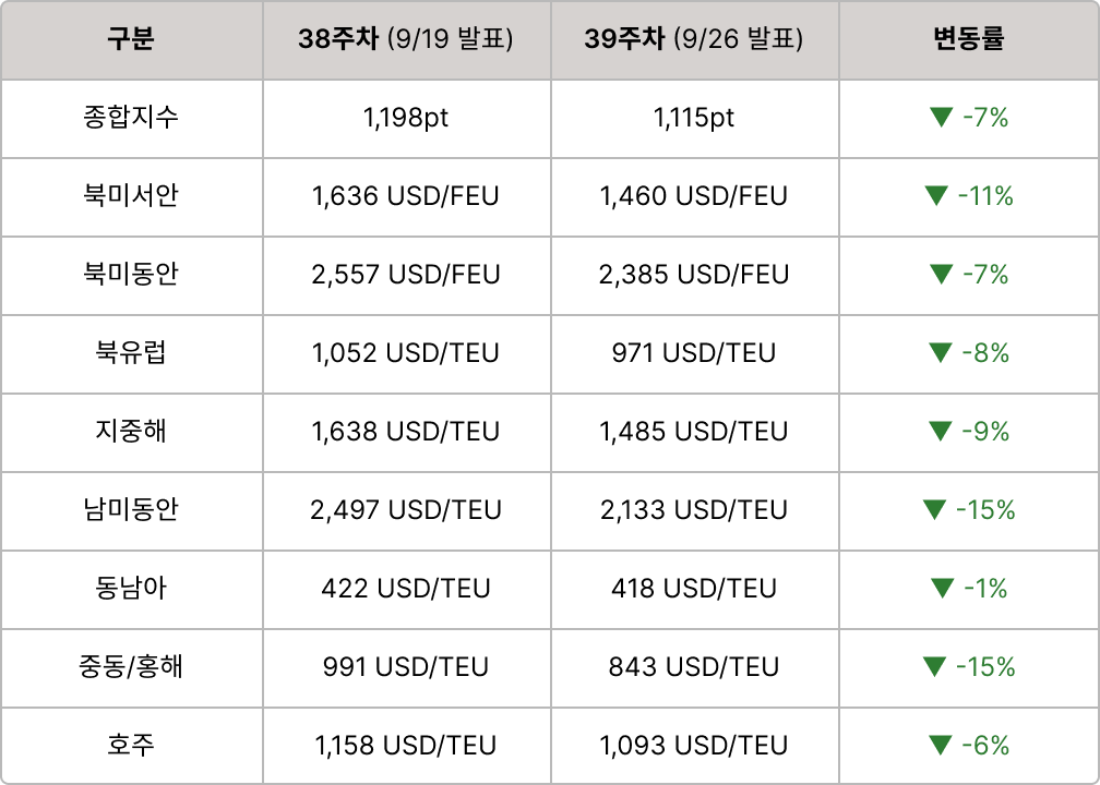 - SCFI 종합지수 1,115pt, 전주비 -7% 하락