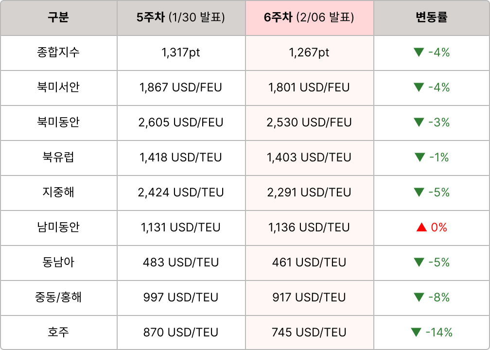 SCFI가 2주 연속 하락하며 해상 운임 약세가 이어졌습니다. 다만 미·인도 관세 인하 합의로 SCFI가 2주 연속 하락하며 해상 운임 약세가 이어졌습니다. 다만 미·인도 관세 인하 합의로 인도발 북미향 물동 반등 기대가 커졌습니다. 항공은 미주 수요는 견조했지만 공급 완화로 운임 상승폭이 제한됐고, 중국발 이커머스 둔화가 하방 변수로 부각됐습니다. |