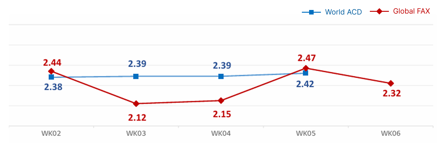 - 한국 ▶ 북미 : 견조한 한국발 수요로 2월에 들어서도 국적사 계약 운임은 대체로 유지되고 있으나, 공급이 완화되면서 운임이 큰 폭으로 오를 여지는 제한적. 반면 중국발 Sea & Air는 춘절 연휴를 앞두고 차터 물량을 보유한 공급사 중심으로 가격 인하 조율 중.