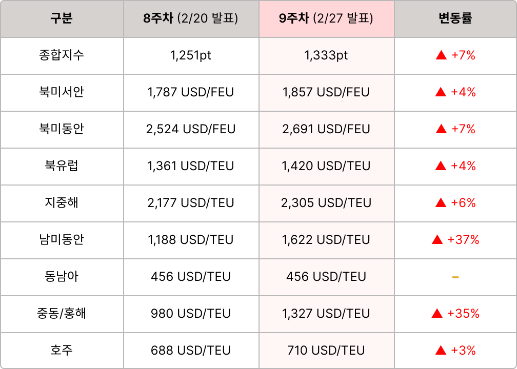 중동 리스크 재확대로 해운·항공 모두 우회 운항·환적 차질 중동 리스크 재확대로 해운·항공 모두 우회 운항·환적 차질 영향이 커졌습니다. 해운은 SCFI가 9주차에 1,333pt(전주비+7%)로 반등했고, 해운은 중동향 부킹이 중단되고 전쟁할증료가 도입되고 있으며, 항공은 중동 환적 축소로 아시아-유럽 직항 쏠림이 심화됐습니다. 또한 미국 IEEPA 관세 위헌 판결 후 환급 소송·집행 절차가 본격화되며 단기 물동량·통관 전략 재조정 이슈도 확대됐습니다. |