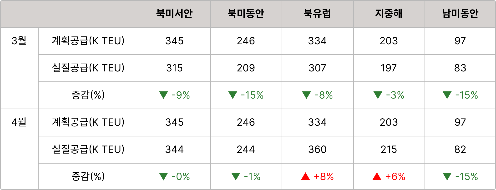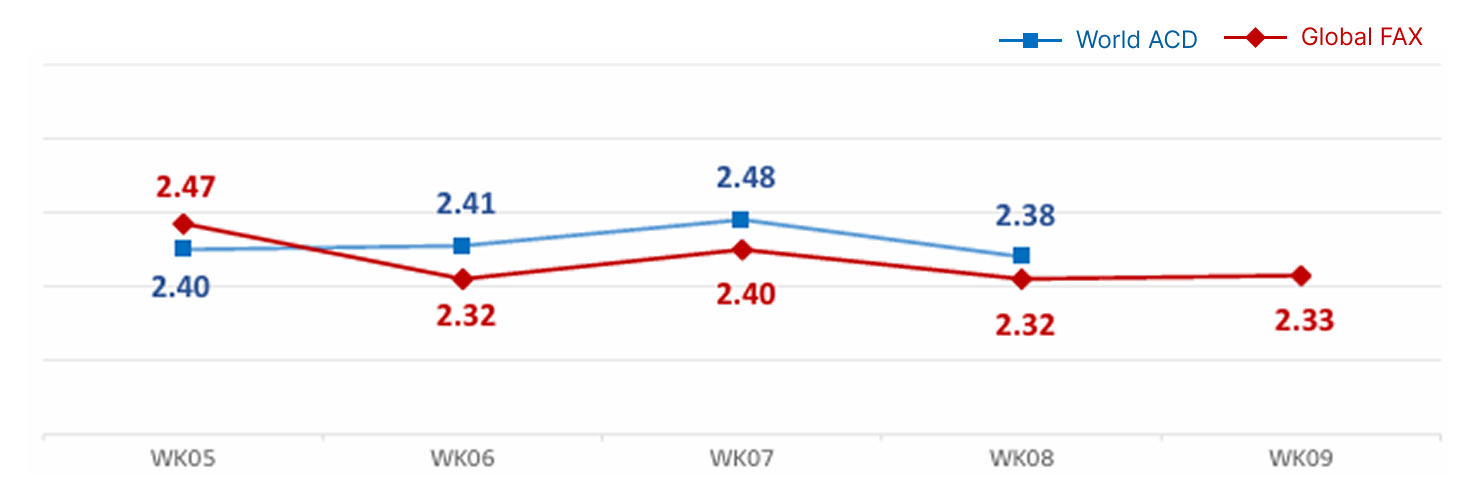 - 한국 ▶ 중국·아시아 : 싱가폴향 공급 축소 및 수요 강세로 적체 심화됨. 중국향은 중국 춘절 종료로 수요 증가, 월말 밀어내기 물량으로 일시적 적체 발생. 일본향은 메가세일로 인해 3월 상반기까지 대부분 공급 마감
